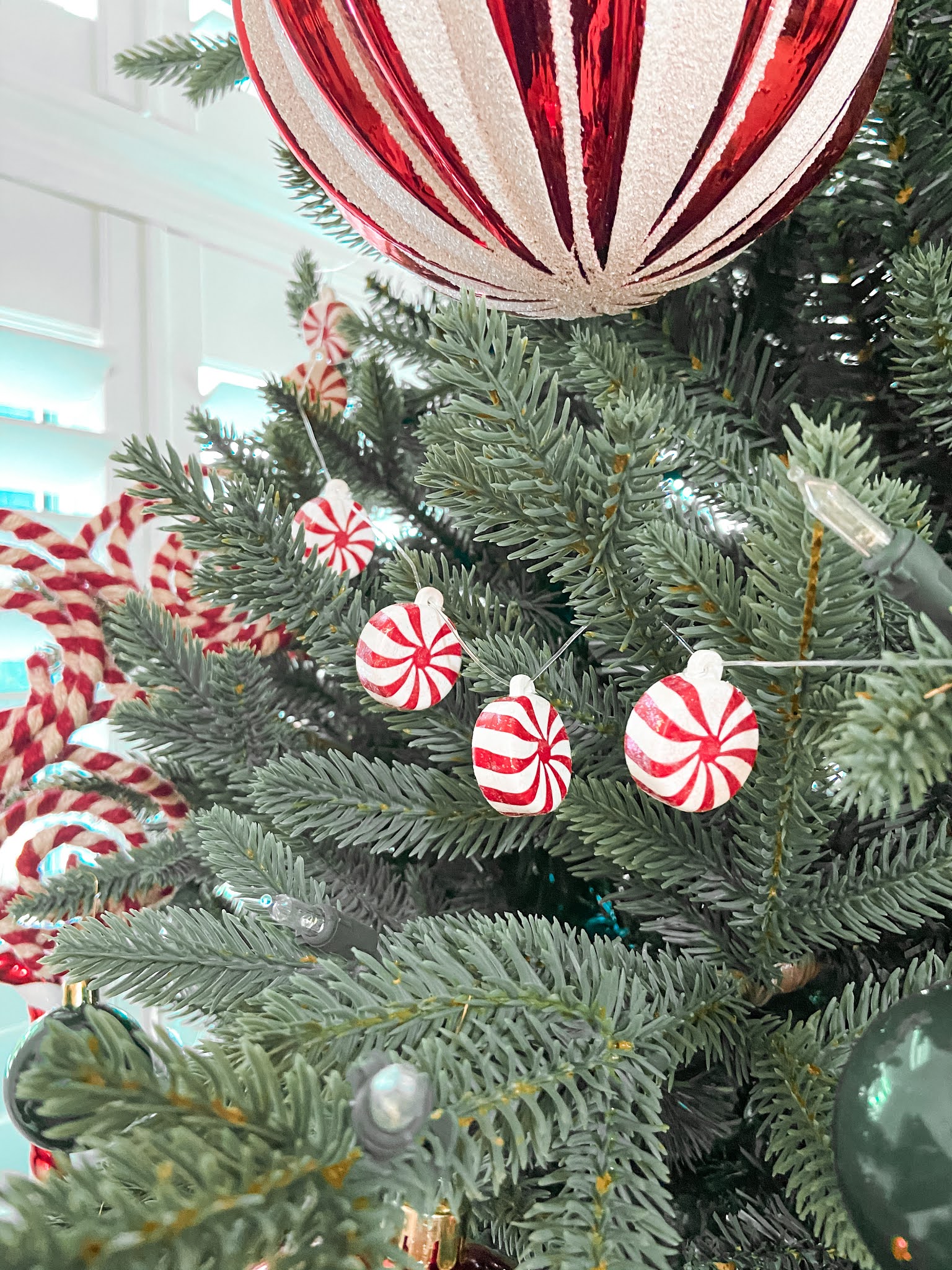We also bought ornaments with individual, dangling peppermints and removed and re-strung them on fishing wire to create a peppermint garland. I think they turned out really cute!
